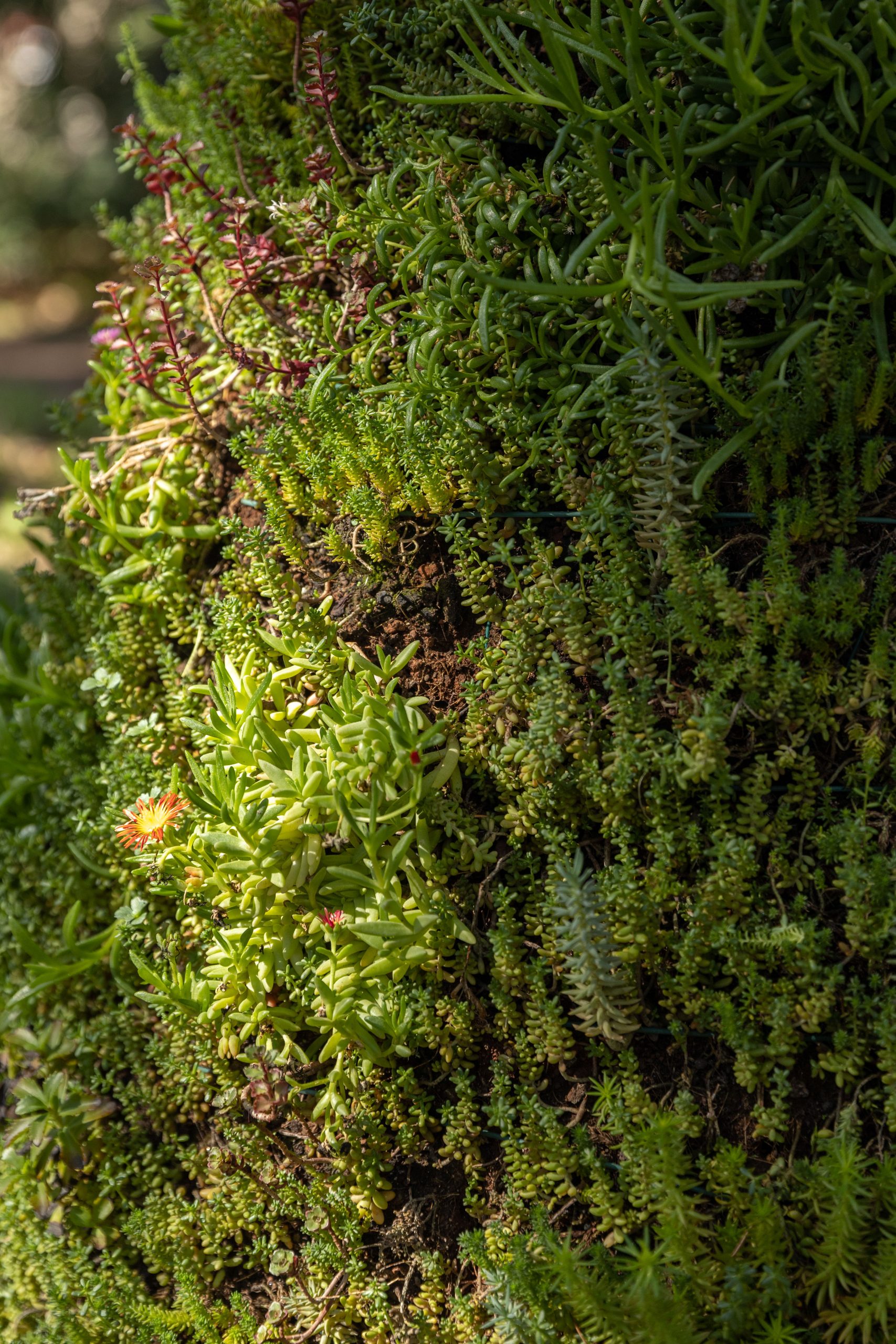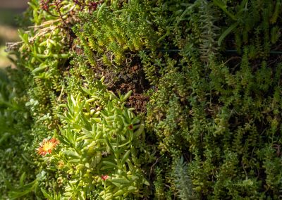 Collocata a sinistra dell’ingresso principale, si costituisce di elementi artificiali ed elementi naturali: è una gabbia metallica riempita di ghiaia drenante, attorno alla quale sono state ancorate varie piante appartenenti alla famiglia del sedum. La gabbia e la ghiaia facilitano il radicamento ed evitano il ristagno dell’acqua. Il sedum è stato scelto perché cresce lentamente, richiede poca manutenzione, non interferisce con le esigenze degli alberi vicini e assorbe gli inquinanti presenti nell’aria. In cima alla struttura è stata collocata la targa del progetto, con il QR code che rimanda a questo sito.