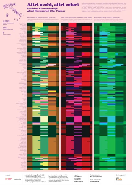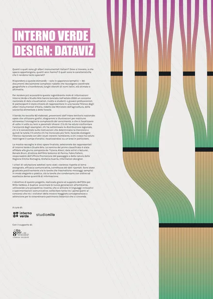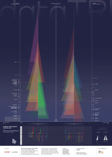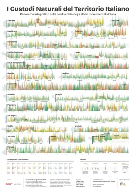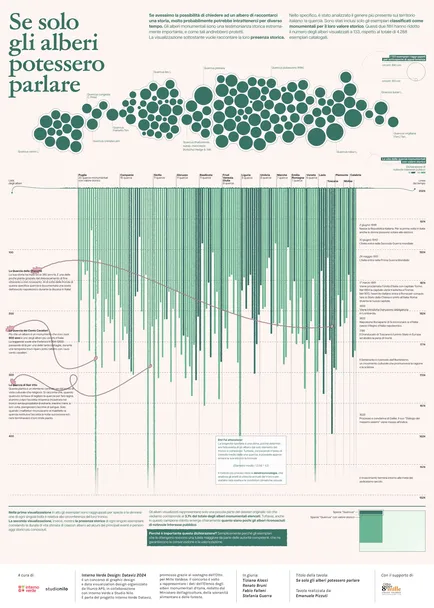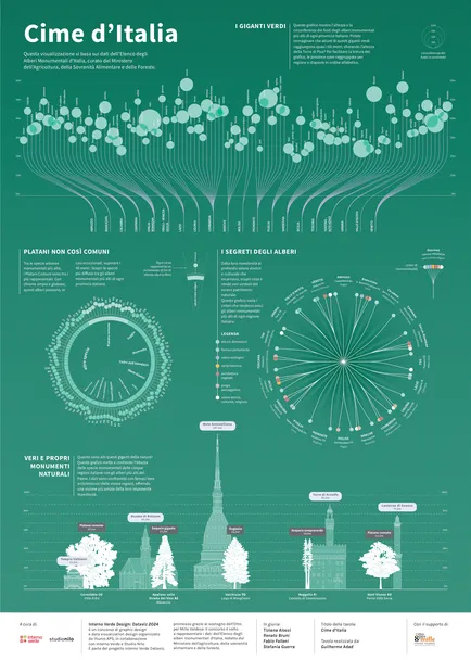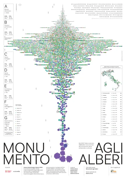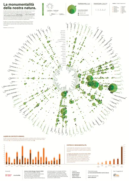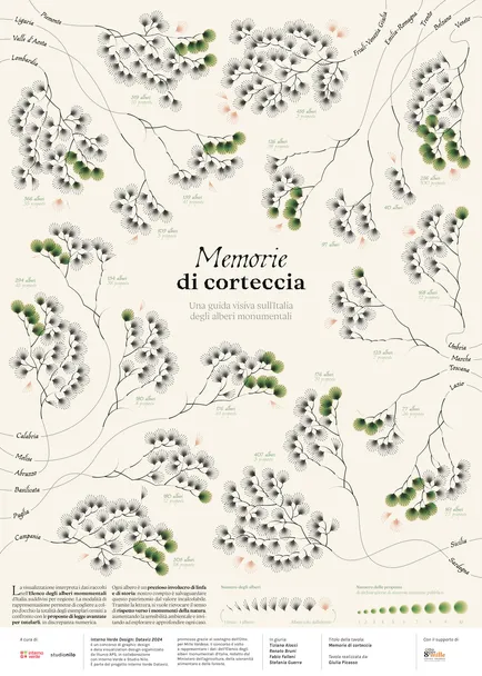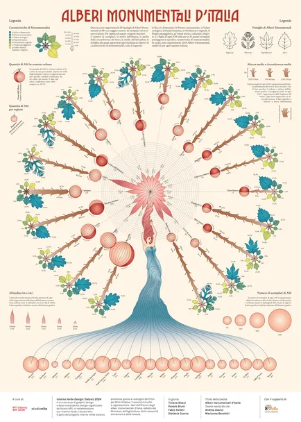 Rispondono a queste domande — solo in apparenza semplici — dei documenti decisamente complessi: tabelle che raccolgono coordinate geografiche e circonferenze, lunghi elenchi di nomi latini, età stimate e altimetrie. Per rendere più accessibile questa ingombrante mole di informazioni Interno Verde e Studio Nilo hanno lanciato nell’estate 2024 un concorso nazionale di data visualization, rivolto a studenti e professionisti under35. Ai partecipanti è stato chiesto di rappresentare in una tavola l’Elenco degli alberi monumentali d’Italia, redatto dal Ministero dell’agricoltura, della sovranità alimentare e delle foreste. Il bando ha raccolto 82 elaborati, provenienti dall’intero territorio nazionale: opere che utilizzano grafici, diagrammi e illustrazioni per restituire attraverso l’immagine la complessità del censimento, e che si focalizzano di volta in volta su temi e parametri diversi. C’è chi ha voluto confrontare l’anzianità degli esemplari, chi ha sottolineato la distribuzione regionale, chi si è concentrato sulle motivazioni che determinano la menzione e quindi la tutela. C’è anche chi ha incrociato più fonti, facendo dialogare l’Elenco nazionale con altri studi inerenti l’ambiente, e chi invece ha voluto restringere il campo d’analisi, focalizzandosi su un’area in particolare.