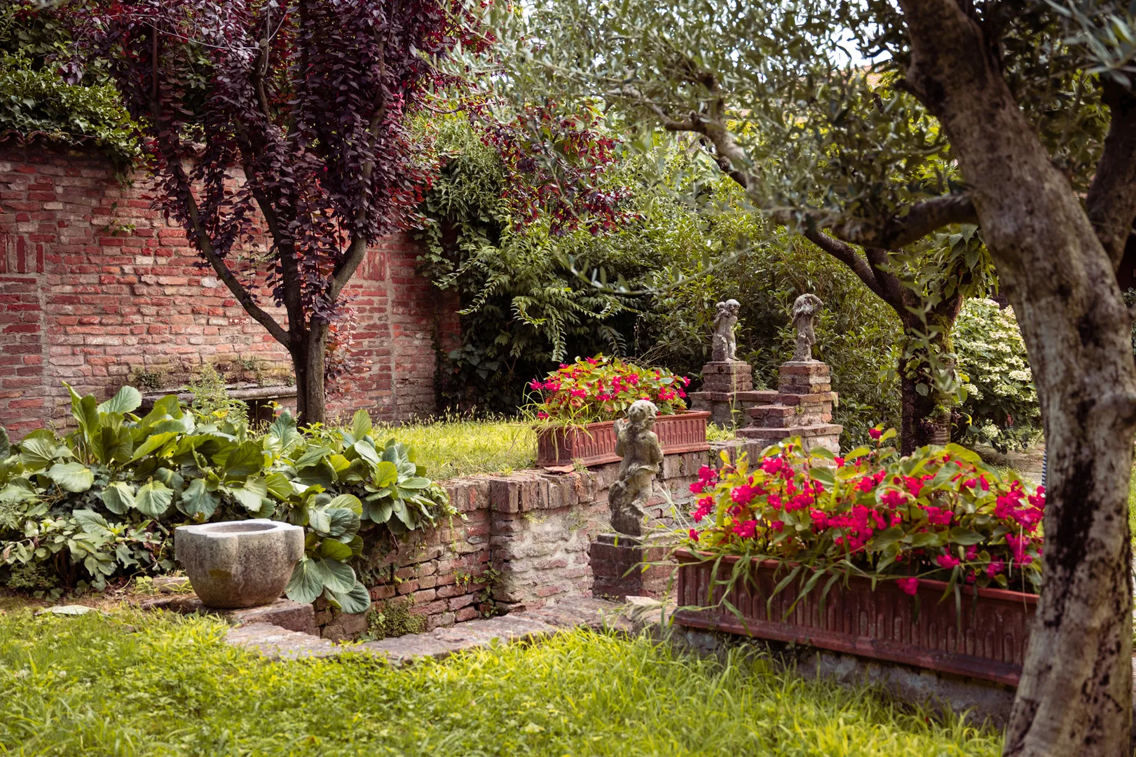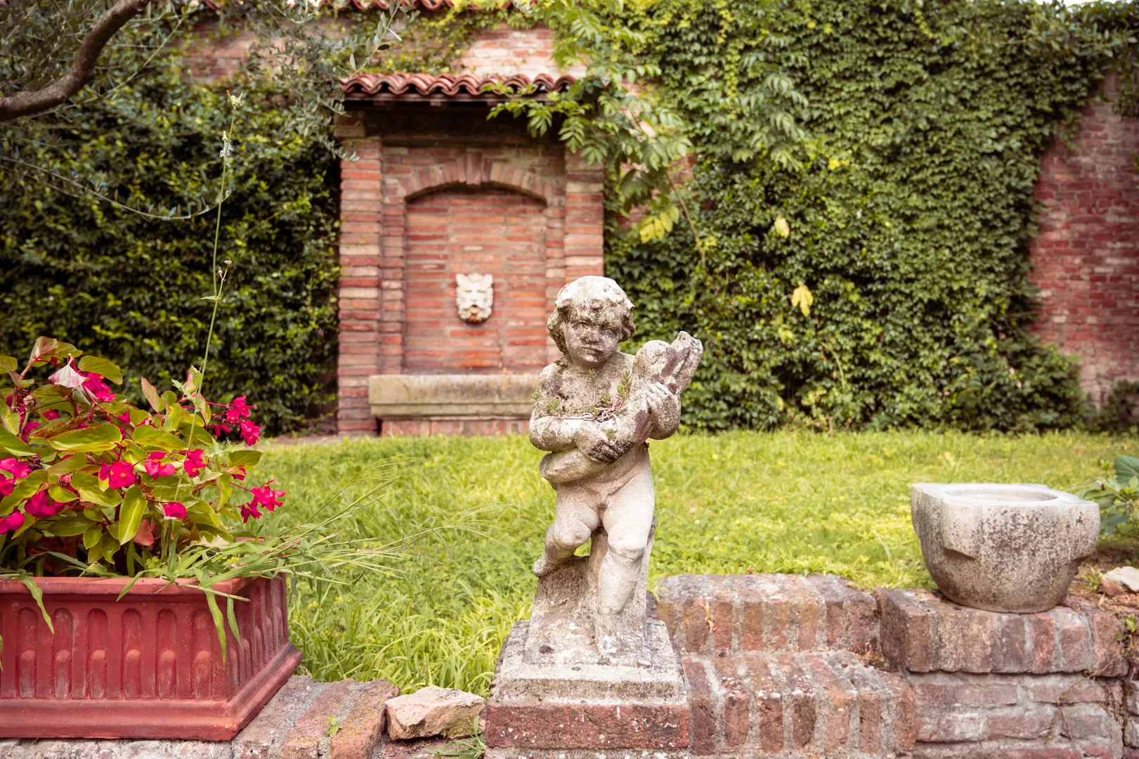 Il geometra demolì ciò che non si poteva conservare in sicurezza e utilizzò le parti sane per organizzare lo spazio, trasformando brani di muratura in sedute e spalliere, sfruttando gli archi per disegnare quinte scenografiche. Una scelta controcorrente, se si considera la fame di parcheggio che determinò in quella decade tanta cementificazione, e la repulsione che all’epoca suscitava tutto ciò che ricordava ai nipoti e ai figli la vita povera dei nonni. Oggi tra gli ulivi e il glicine, le rose e il giuggiolo, si scorge un frammento della Mantova che fu. Le statue che chiazzano il prato qua e là hanno provenienze varie. Si incrociano fauni, putti, cornucopie. Da notare sulla destra il grande capitello decorato: è stato trovato per caso nel lago e – sebbene non via siano certezze – pare possa attribuirsi al vecchio Ponte dei Mulini, bombardato dagli Alleati nel 1944.