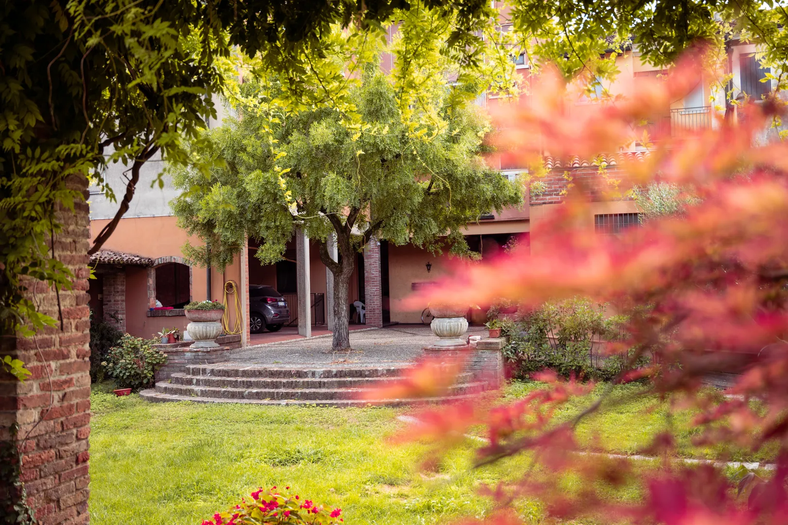 Nella piatta pianura padana è davvero inconsueto imbattersi nella profondità, nel gioco dei piani, nella stratificazione dei fondali. Eppure qui succede, e lo sguardo si apre incredulo, distratto dalle macchie luminose e mobili delle betulle, dalla nuvola calda, scintillante d’oro e di ruggine, dell’acero giapponese, dal morbido digradare e risalire del prato, punteggiato di indecifrabili vestigia architettoniche. Da cosa nasce questo spazio, così ampio e stupefacente? Non appartiene a un palazzo nobiliare, datato e titolato, si riferisce anzi a una costruzione moderna, a un condominio edificato nella seconda metà del Novecento, ma conserva come un segreto un respiro antico, il ricordo della campagna. L’immobile inizialmente non disponeva di uno scoperto: l’area fu acquistata e annessa negli anni Settanta grazie alla felicissima intuizione del geometra Adalberto Aitini, che non solo riconobbe e colse al volo l’occasione, ma volle – con non comune slancio creativo – mantenere il rustico ottocentesco che malamente sopravviveva in mezzo agli alberi e alla vegetazione, mezzo diroccato e pericolante.