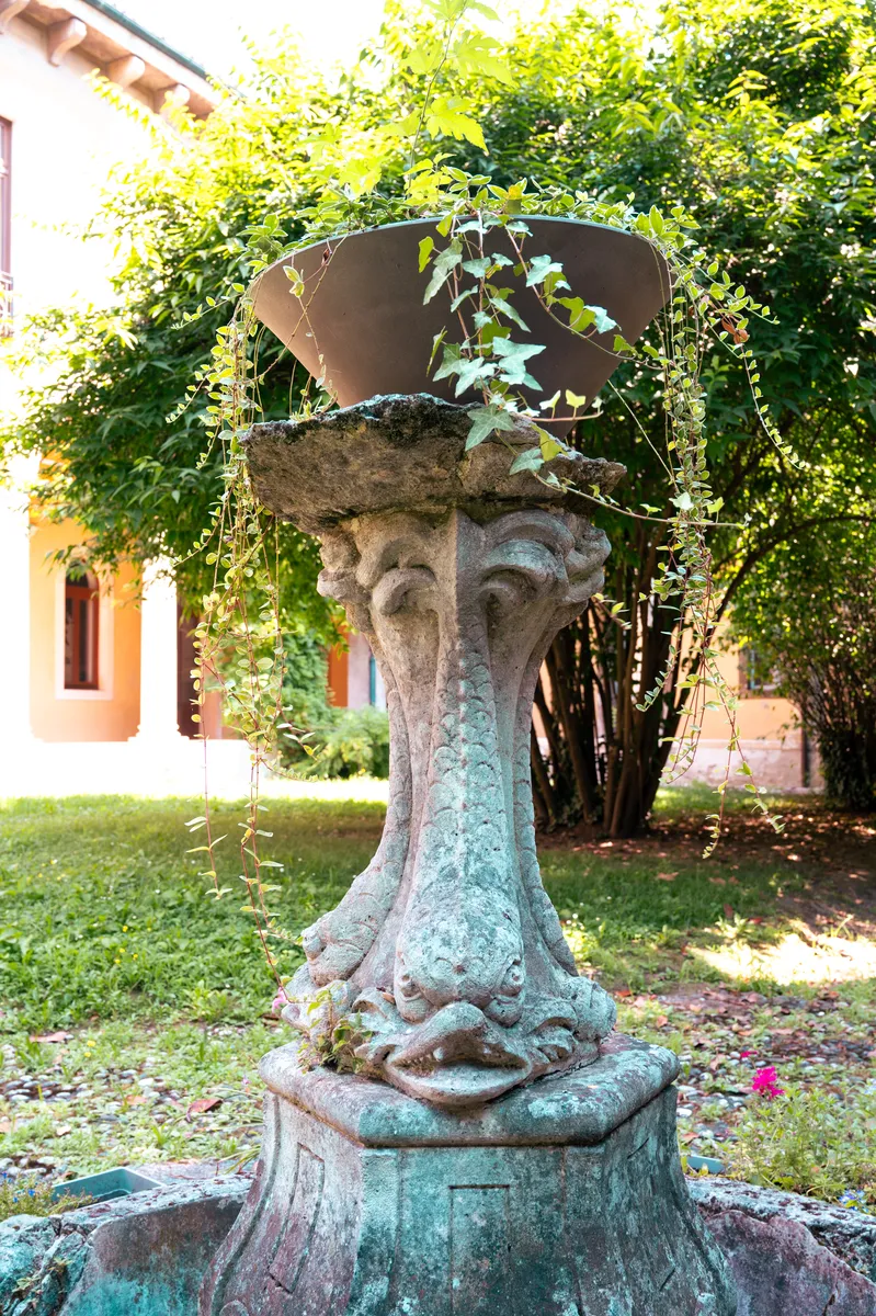 Il giardino della scuola Giusti ha un bel gusto retrò. Con la fontana centrale e il delfino in pietra, le roselline che si attorcigliano alle colonne del loggiato, le magnolie lucide.