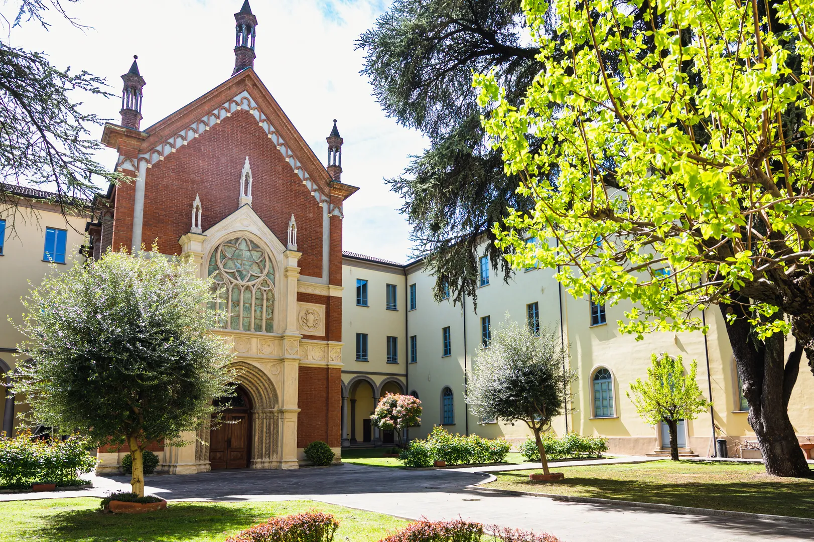 Il chiostro però restò il classico chiostro. L’imprevisto che svolta completamente la traiettoria della narrazione si ebbe nell’Ottocento, a opera del vescovo Giovanni Battista Scalabrini. Egli infatti decise di inserire dentro al chiostro una cappella dedicata a Sant’Opilio, protettore dei seminaristi, ed è da quel momento che l’idea classica e stereotipata che tutti bene o male hanno in mente s’è fatta da parte, perché nel mezzo del prato è spuntata una chiesetta neogotica. Il progetto dell’edificio, attribuito a Giuseppe Perreau, fu realizzato tra il 1887 e il 1890. La facciata fu costruita successivamente, nel 1928, su progetto di Paolo Costermanelli, a cui venne affidato anche l’incarico di ridisegnare la porta d’ingresso del complesso.