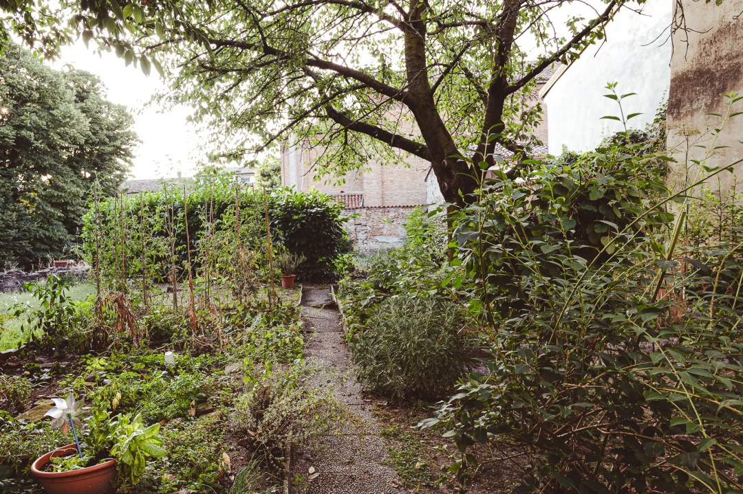 Superando il corridoio ed entrando in giardino si incontra sulla destra la collezione delle grasse e delle succulente, ma ad attirare per primo l’attenzione di chi non è mai stato qui è sicuramente l’orto, dove le verdure si mescolano ai fiori. La coltivazione si apre con i solanum, gli ellebori, le delicate bacche arancioni degli alkekengi. Sulla destra sfilano le rose e gli oleandri. Tra gli alberi si nota il ciliegio e il calicanto, c’è anche un ulivo ma resta più defilato, a sinistra.