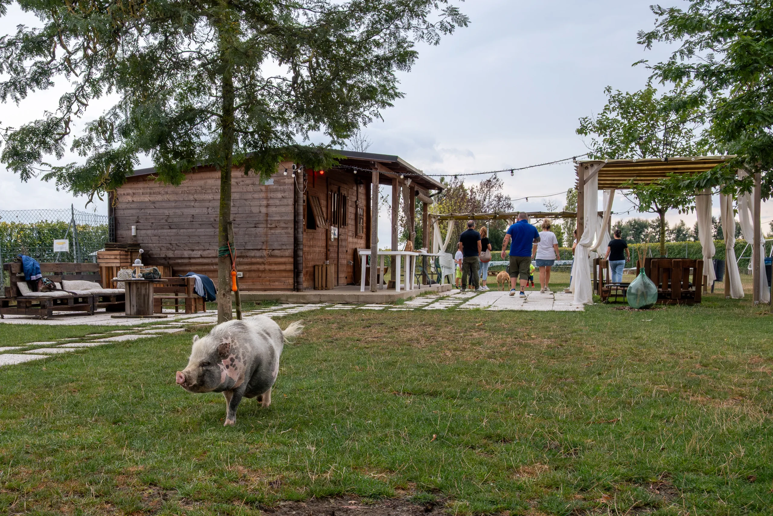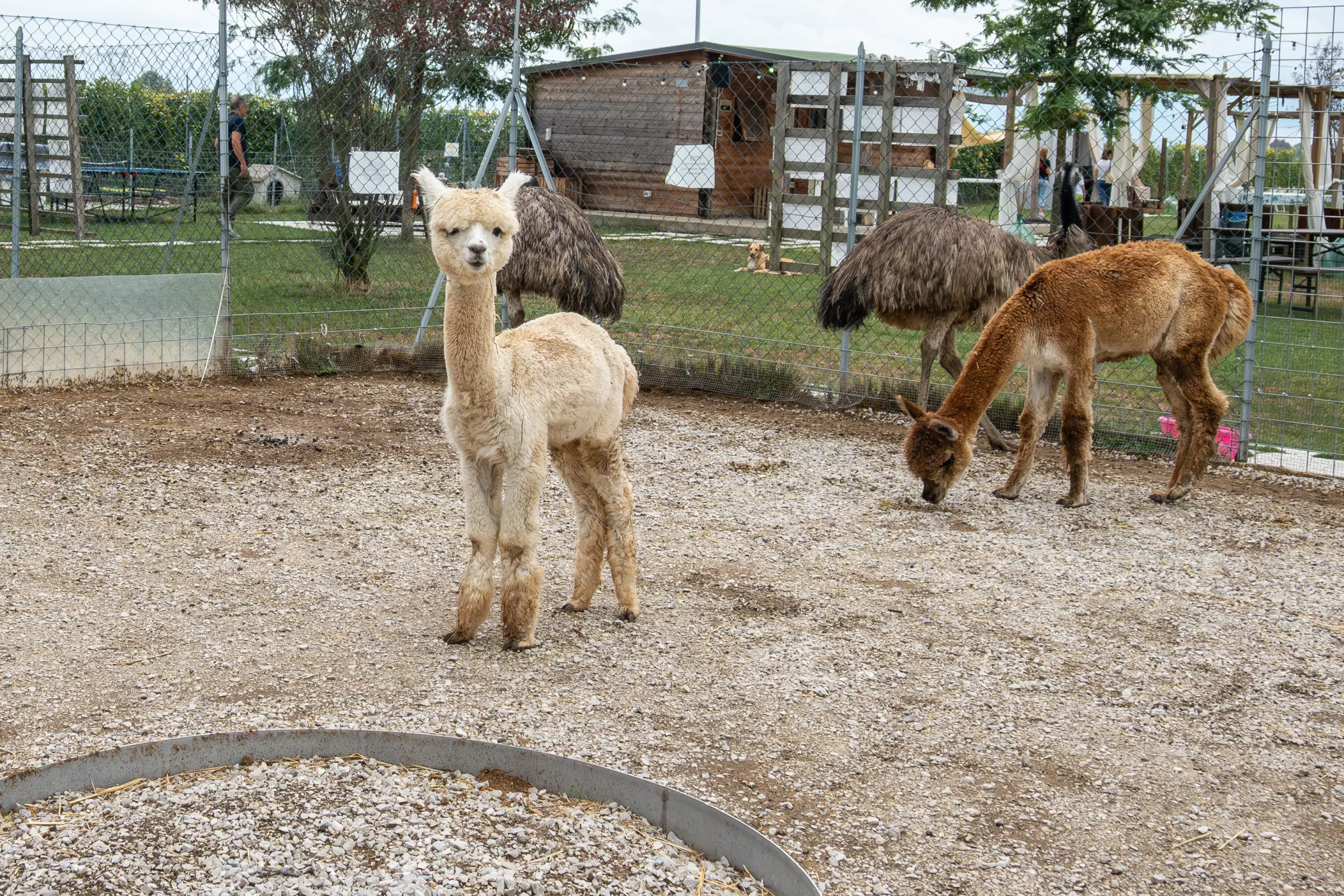 «Nel 2019 avevano fatto un corso a Bolzano per conoscere gli alpaca e ne avevano comprati due», raccontano le titolari. «All’inizio non avevamo in mente di creare un’attività, semplicemente avevamo posto. Poi ne abbiamo presi altri due, poi sono arrivati gli animali tipici della fattoria.. e alla fine anche gli emu, due anni fa. La loro funzione principale è quella di fare compagnia agli alpaca». Il cuore della loro proposta al pubblico è il trekking in compagnia di questi buffi, morbidi camelidi, originari del Sud America. Ma alle passeggiate si possono abbinare anche altre esperienze, come il laboratorio di apicoltura, organizzato insieme alla vicina Corte Fratta, oppure la degustazione di vino o lo yoga. L’area verde – punteggiata di salici, robinie e pruni rossi – si presta a tanti utilizzi ed è ben attrezzata: ci sono le griglie, i gonfiabili per i bambini, c’è anche il proiettore per il cinema all’aperto. E ovviamente ci sono gli animali: otto alpaca, un cavallo, dieci conigli ariete, un tacchino, due pecore, un asino, un pony stallone di nome Ride, che spesso viene scambiato per una femmina incinta, quattro capre, sette pavoni (una coppia con cinque piccoli), una quarantina di polli, tutti maschi per evitare combattimenti e litigi, praticamente una comunità monastica, due maialini, due cani e due gatte identiche.