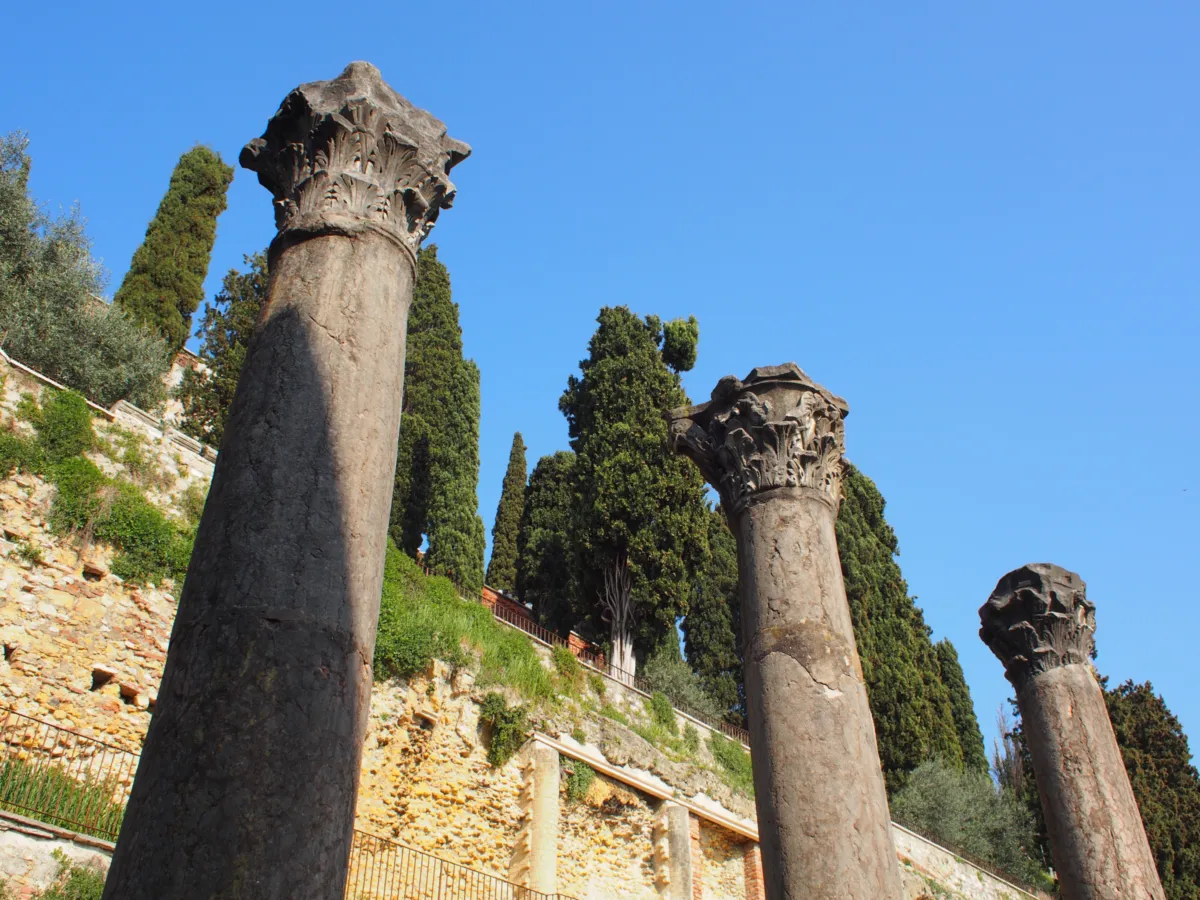 L’attività era facilitata dalle abbondanti acque che scendevano dal colle di San Pietro, in cima al quale era allestita anche una fontana pubblica, la Botte da cui prende il nome il vicolo di accesso alle terrazze. Una volta era proprio qui che si coltivavano la frutta e la verdura che serviva alla mensa della comunità, le piante aromatiche e le officinali da cui si ricavavano pomate ed elisir. Oggi la terrazza è un museo a cielo aperto, prosegue nel verde, circondata e sovrastata dai cipressi, la ricca esposizione di reperti architettonici, epigrafi e monumenti funerari di epoca romana. Oltre a offrire ai visitatori un panorama mozzafiato e una prospettiva inedita sul sottostante Teatro Romano.