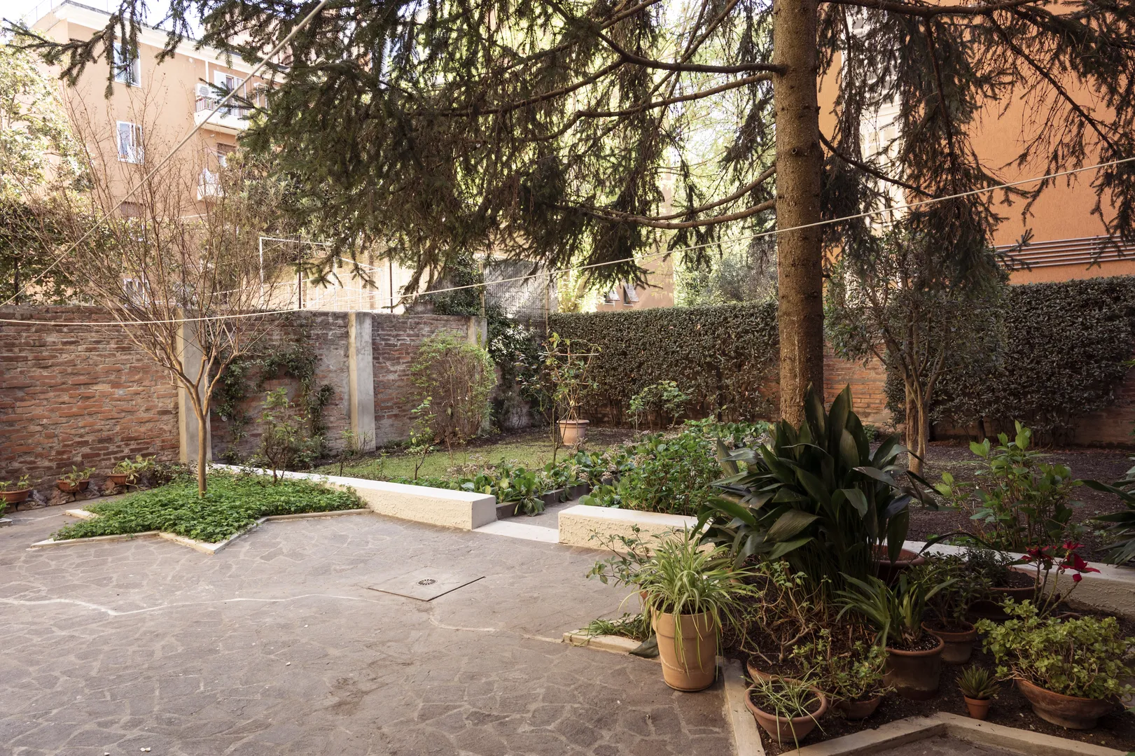 Il curioso disegno delle aiuole a stella risale al 1954. Oggi ad occuparsi con attenzione e amore delle piante è la signora Anna. Lungo il corridoio cresce la bergenia; in fondo l’alloro e l’oleandro, sulla destra l’alberello di ligustro. Nell’aiuola a sinistra si incontrano la lagerstroemia, il pungitopo e le fragoline selvatiche. Vicino al muro, non lontano dal calicanto, si attorcigliano le tre rampicanti: il gelsomino, l’evonimo Emerald’n Gold e una pianta selvatica appartenente alla famiglia degli agrumi. Le tartarughe le ricordano tutti con affetto: ci sono sempre state.