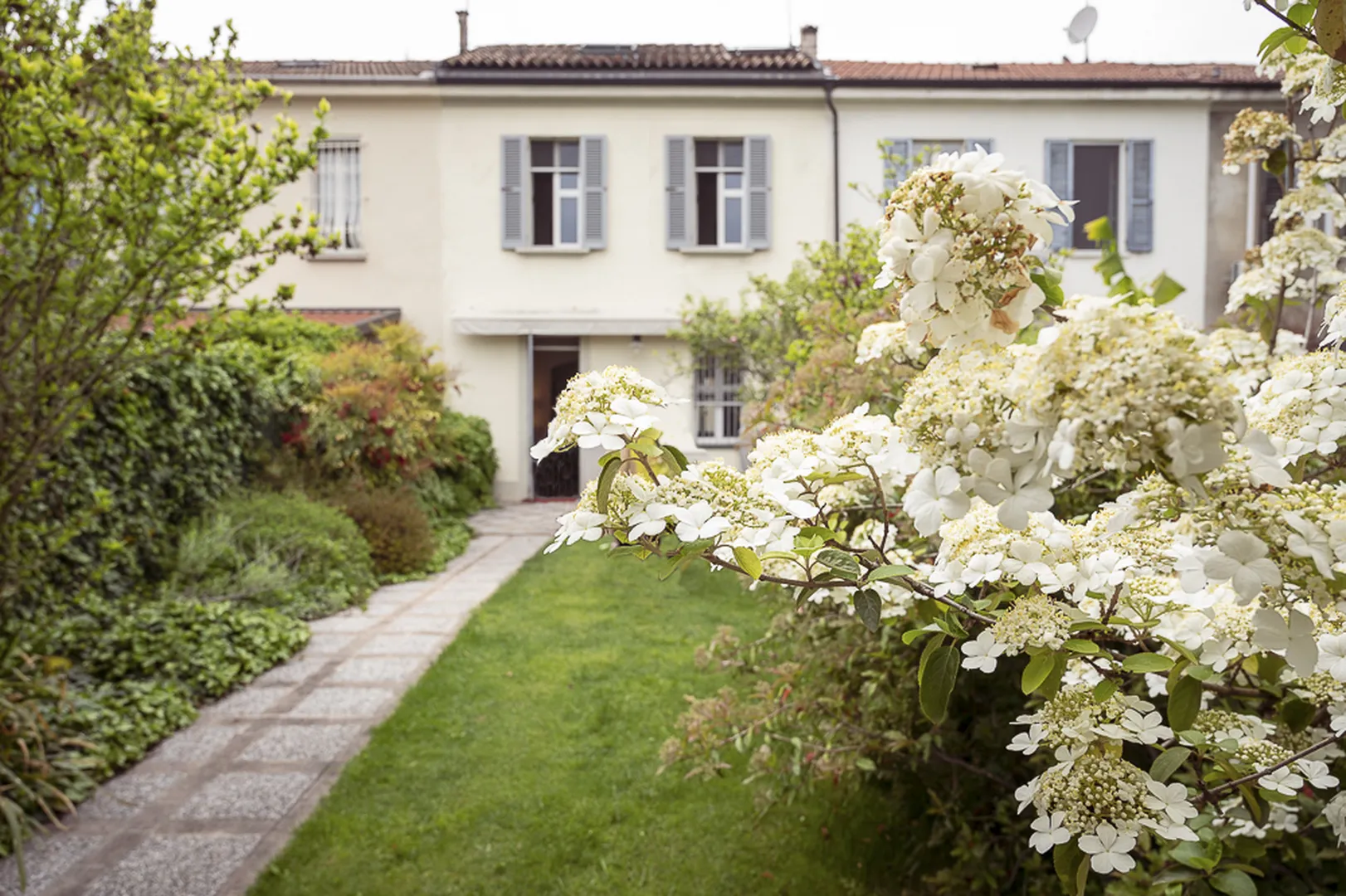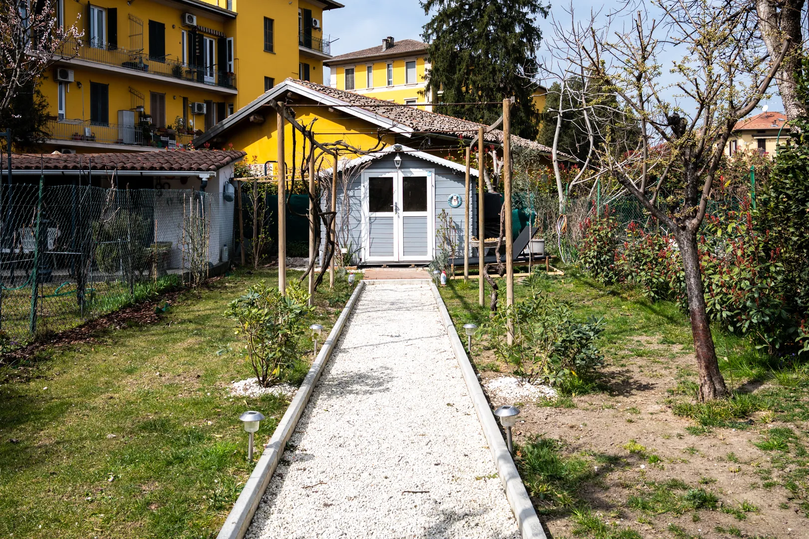 Nella fattispecie in questo piccolo e curato angolo di verde, al civico 52, si palesa una viva propensione per l’edera. Sotto al rampicante, sulla destra, crescono la quercifolia, la nandina, il caprifoglio, l’abelia, le peonie e l’ibisco. A sinistra il rosmarino, le rose, il cotoneaster, la magnolia stellata e le ortensie. Al civico 57 ciò che colpisce è il sentiero che conduce alla graziosa casetta degli attrezzi, pergolato e coperto di uva fragola. A sinistra, oltre alla siepe di photinia, crescono il susino, il pitosforo, la rosa Charlene di Monaco. A destra il pero, l’ulivo, la rosa Aspirin e la rosa cubana. Vicino all’abitazione, nell’accogliente salotto all’aperto, vicino alla statua della portatrice, si arrampica il gelsomino, accompagnato dall’evonimo. In fondo il prato è punteggiato di lavanda, peonie e serenella profumata. Ad accogliere gli ospiti: la gatta Lola e il cane Nina, piccola ma decisa.