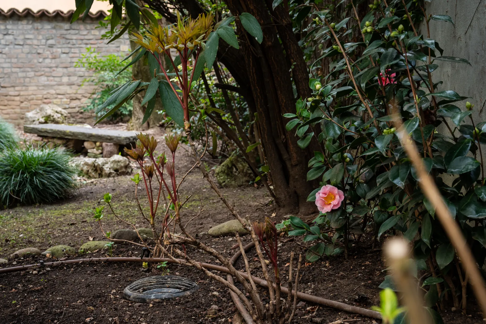 Un basso muretto separa lo spazio pavimentato dal prato, a cui si accede superando un arco coperto di caprifoglio rampicante. Sulla destra, vicino al tasso e alla maonia, si trova l’aiuola delle acidofile: ortensie, camelie e peonie. A sinistra chiude l’area un folto bambù, che protegge e rende lo spazio ancora più intimo e raccolto. Al centro gli alberi da frutto: il pruno e il ciliegio selvatico. Tra le essenze che movimentano il gioco dei volumi si trovano: la nandina, l’osmanto, la photinia, il viburno, il ligustro, il pungitopo e l’alloro, insieme ai più bassi cespugli di festuca. Tra le rose la bellissima banksiae, che fiorisce in giallo una volta all’anno, e la chinensis mutabilis, la cui prolungata fioritura si sbizzarrisce nel mescolare colori e tonalità, che variano dall’arancio, al rosso, al rosa. Al termine dei percorsi, al posto di una vecchia fontana, è stato allestito un piccolo angolo zen, con una lanterna giapponese in pietra.